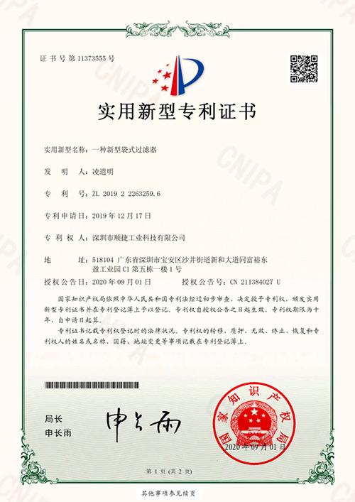 實(shí)用新型專利證書(一種新型袋式過(guò)濾器)