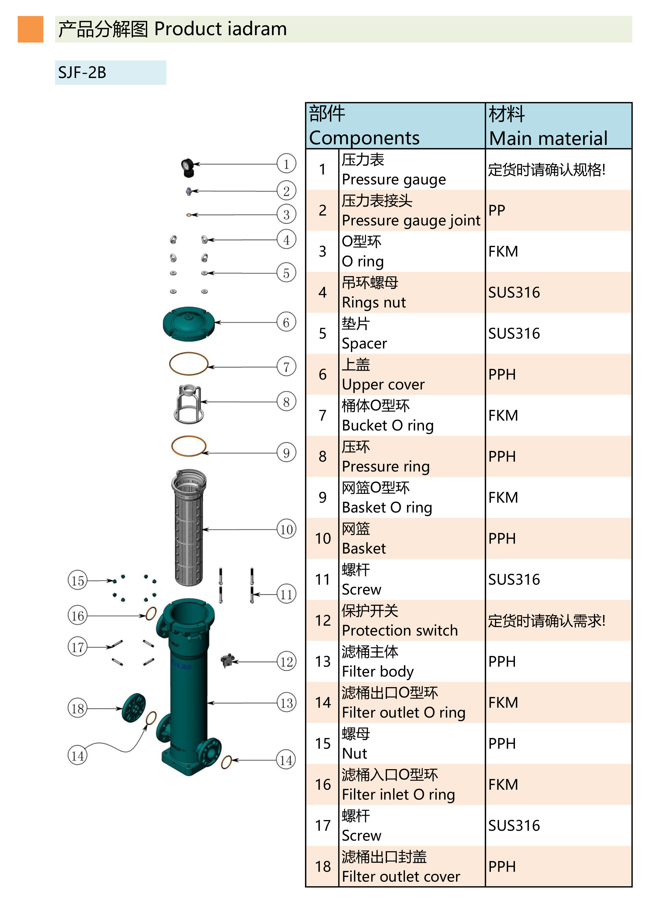 SJF-2B-65產(chǎn)品特點(diǎn): ●.此過濾器可配標(biāo)準(zhǔn)2#過濾袋(φ180*810MM)。也可裝外徑62MM*30″的濾芯6支,外徑68MM*30″的濾芯5支,30″大流量濾芯1支。加長款可裝外徑62MM*40″的濾芯6支,外徑68MM*40″的濾芯5支,40″大流量濾芯1支。 ●.此過濾器是按國際通用標(biāo)準(zhǔn)設(shè)計制造的,能與國際知名品牌(如EATON、FSI、PALL等)的濾袋相匹配,也能與國內(nèi)標(biāo)準(zhǔn)濾袋相匹? ? ? ?配。 ●.桶體采用一體成型設(shè)計,結(jié)構(gòu)堅(jiān)固可靠,無任何焊接點(diǎn),徹底解決漏液之慮。 ●.重量輕,進(jìn)口PPH原料一體成型,對絕大多數(shù)化學(xué)品具有很好的抗腐蝕性能??啥ㄖ芇VDF/ETF...